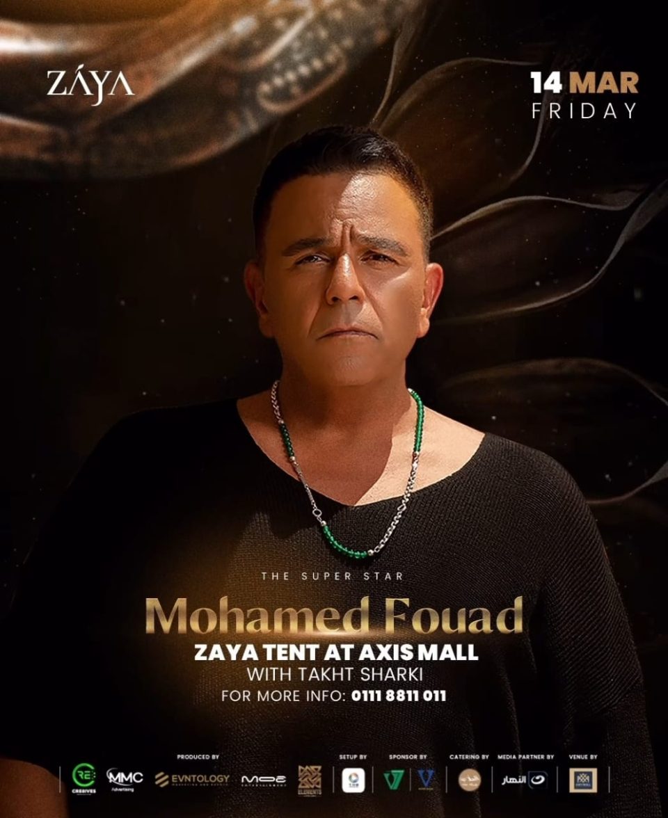 يستعد النجم محمد فؤاد لإحياء سهرة غنائية استثنائية يوم الجمعة 14 مارس المقبل بمصاحبة تخت شرقي، في أحد إحدى المولات الشهيرة بالتجمع الخامس من خلال خيمة zaya