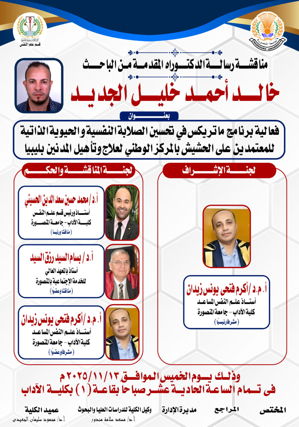 فيما تتكون لجنة المناقشة والحكم والإشراف من نخبة من الأساتذة المتخصصين، على النحو التالي الدكتور محمد حسين سعد الدين الحسيني أستاذ ورئيس قسم علم النفس بكلية الآداب جامعة المنصورة “مُناقشًا ورئيسًا للجنة” والدكتور بسام السيد رزق السيد أستاذ بالعهد العالي للخدمة الإجتماعية بالمنصورة “مُناقشًا وعضوًا” والدكتور أكرم فتحي يونس زيدان أستاذ علم النفس المساعد بكلية الآداب -جامعة المنصورة “مُشرفًا وعضوًا”.